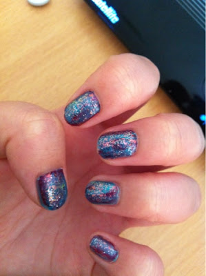 So last night i was really bored and i decided create a little look with my nails. It might look slightly tacky but i swear it looks better in real life. I wanted to do galaxy nails but the only way i could do it and probably achieve it (from what i can think of is marbling - which is messy) so i did the most noobiest thing and got a coat of purple nail polish (Revlon's Plum Attraction) and a teal aqua nail polish (Incolor by Jordana in Ocean View) swiped a few coats on top of each other to create a streaky effect to create a somewhat 'galaxy' effect (kinda fail but it made do) and i finished it off with some plain silver glitter nail polish and Nubar's G188 flakey nail polish.